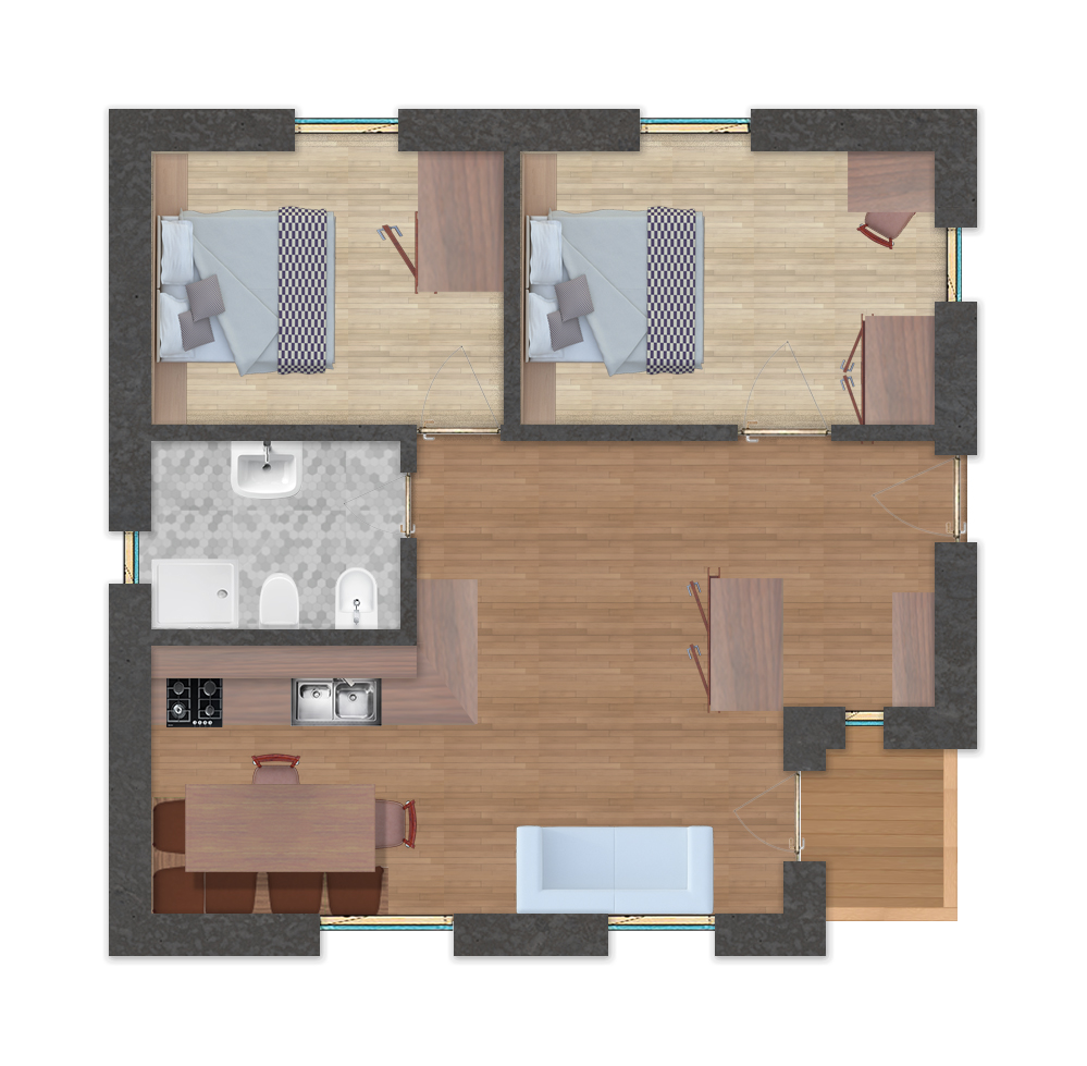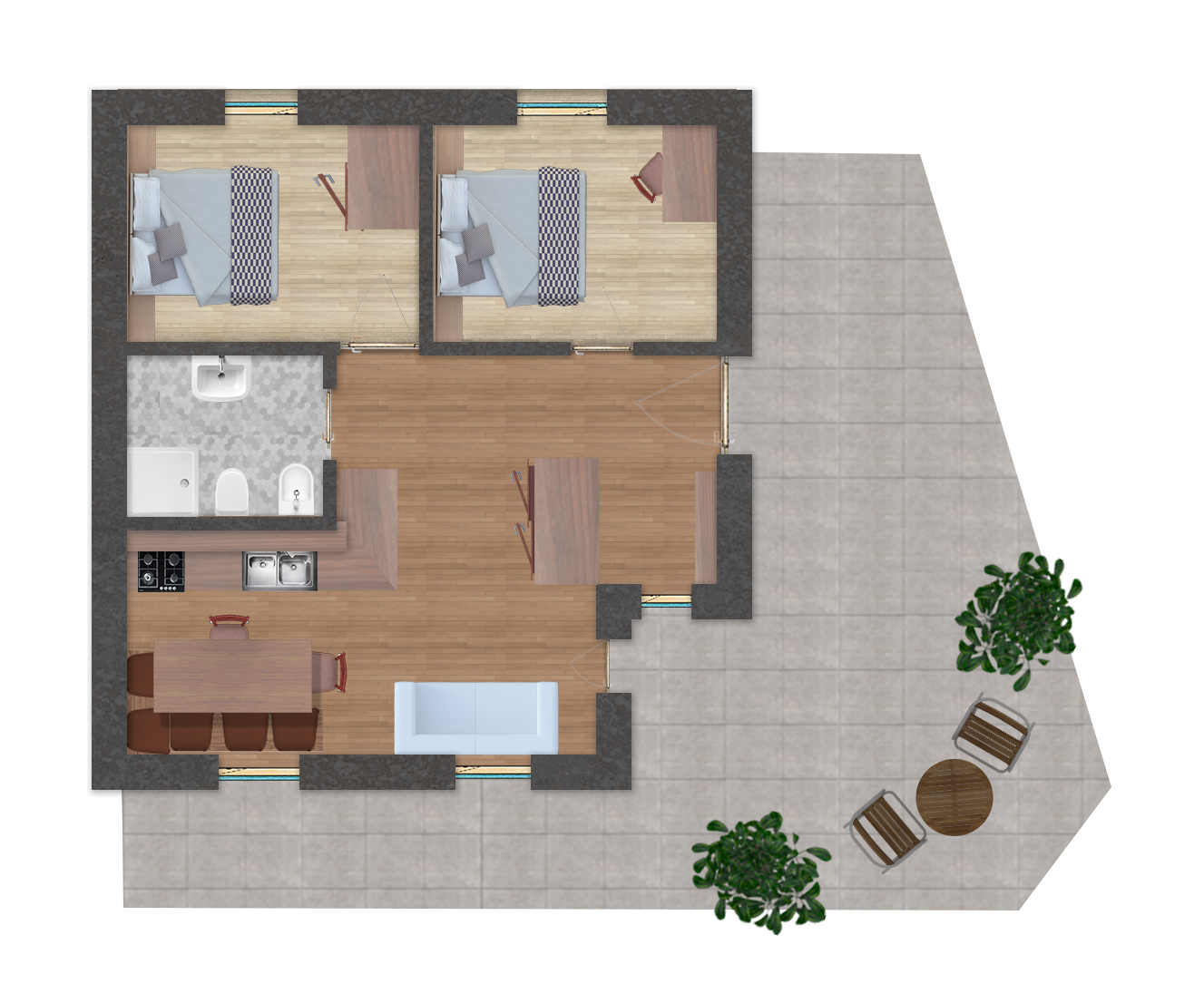 Questo appartamento, di 50 metri quadrati, si trova al pianoterra e può ospitare da 2 a 5 persone. È composto da 2 camere da letto, una matrimoniale e una con letto doppio e letto aggiuntivo, salone con tv e angolo cottura attrezzato. Il bagno è dotato di wc, doccia e bidet. L'alloggio comprende inoltre un ampio terrazzo.
